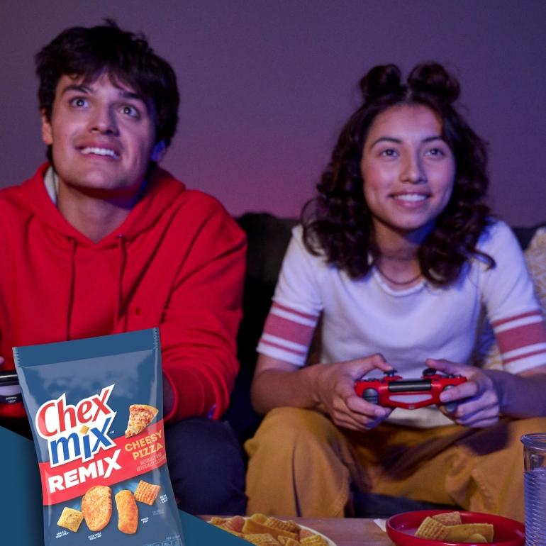 Remix your pizza craving with Chex Mix Remix Cheesy Pizza! With individually flavored pieces of Pizza Sauce Chex, Pizza Crust Bagel Chips, Cheese Puffs, and Garlic & Herb Chex, you can build your own perfect bite.